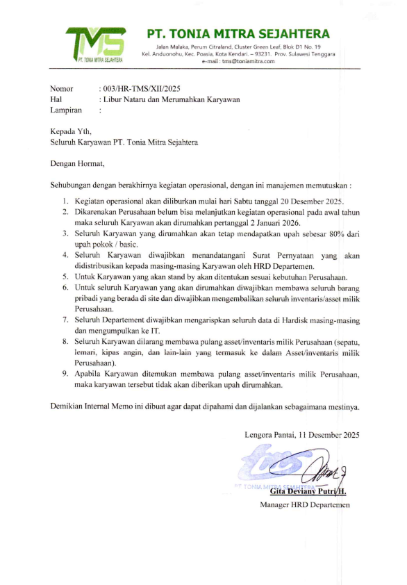 Metrosultra.id, Bombana – TMS kembali mengeluarkan kebijakan yang membuat banyak karyawan terdiam lama membaca memo internal yang baru saja dibagikan. Saya sendiri, saat melihat isi memo itu, hanya bisa menarik napas panjang. Isinya jelas: operasional dihentikan, dan seluruh karyawan harus bersiap menghadapi masa dirumahkan. 12/12/2025.